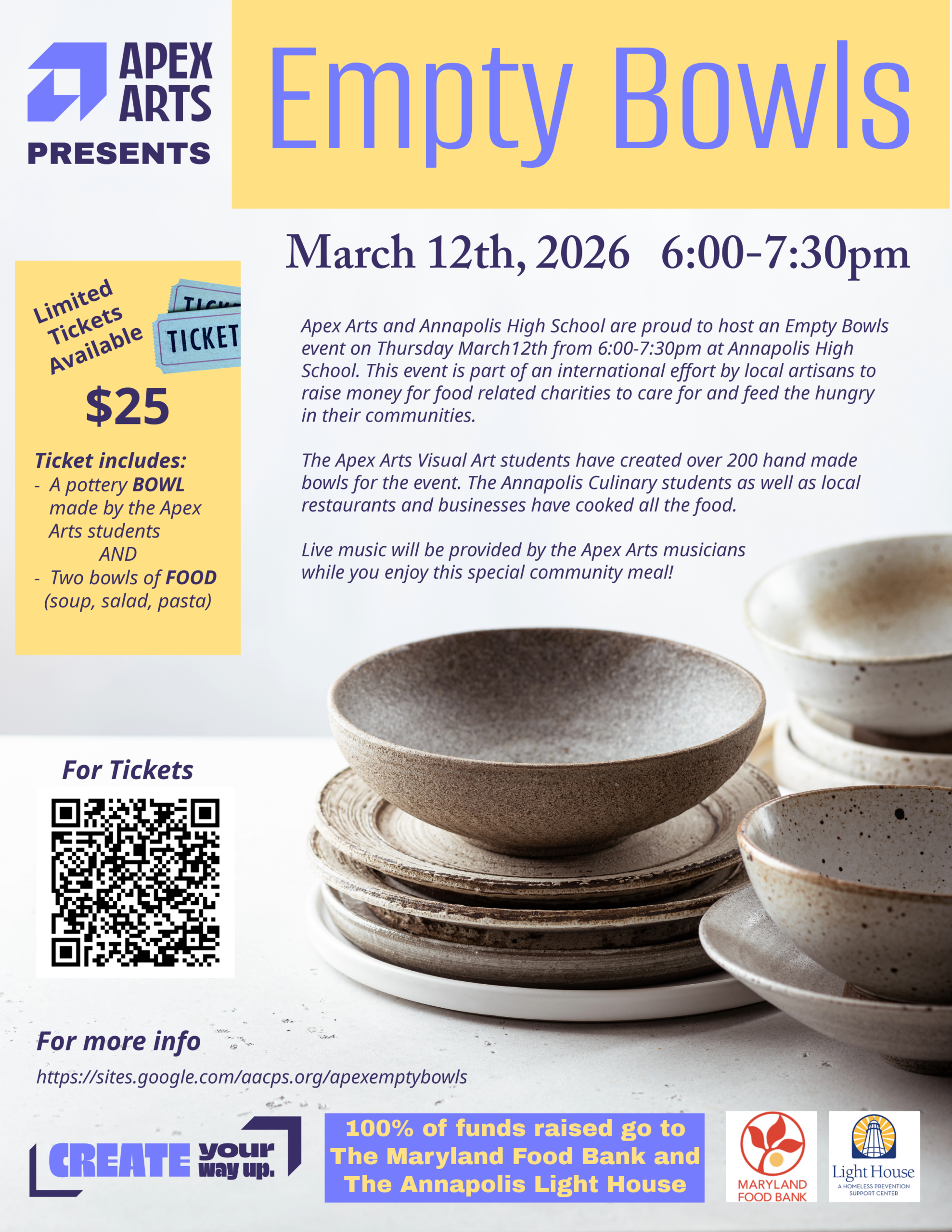 Contact :Amy Begg-MarinoEmail : abegg-marino@aacps.orgZip : 21401Event Name: Empty Bowls, Annapolis MD, https://sites.google.com/aacps.org/apexemptybowls/homeName of organization : Apex Arts and Annapolis High School (AACPS)Date : 2026-03-12Details: https://sites.google.com/aacps.org/apexemptybowls/home